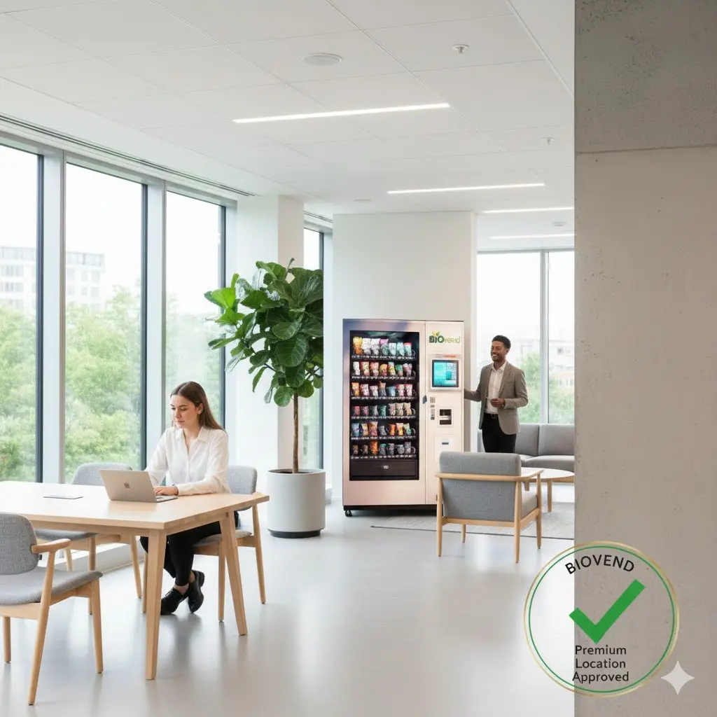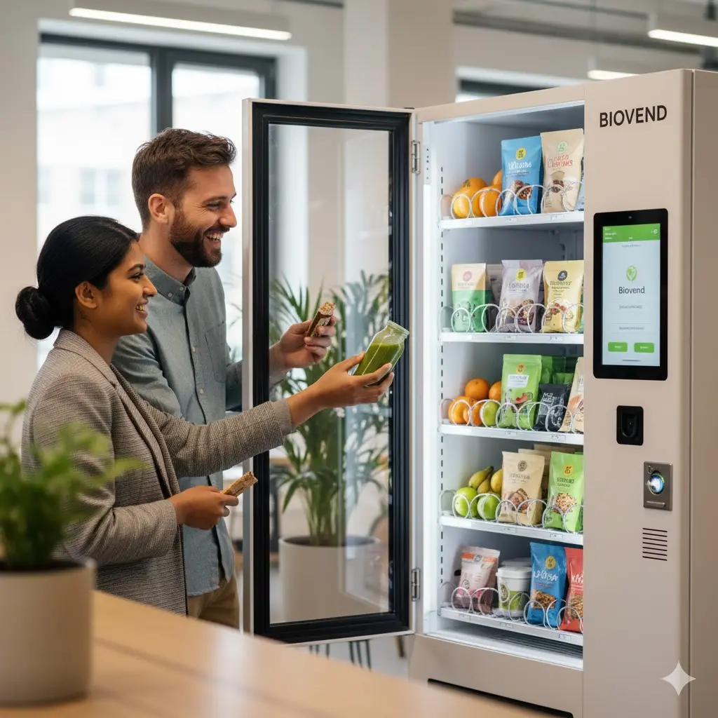 BIOVEND installa e gestisce interamente una dispensa automatica refrigerata con prodotti 100% vegetali BIO, ideale per realtà con almeno 60–80 persone al giorno.